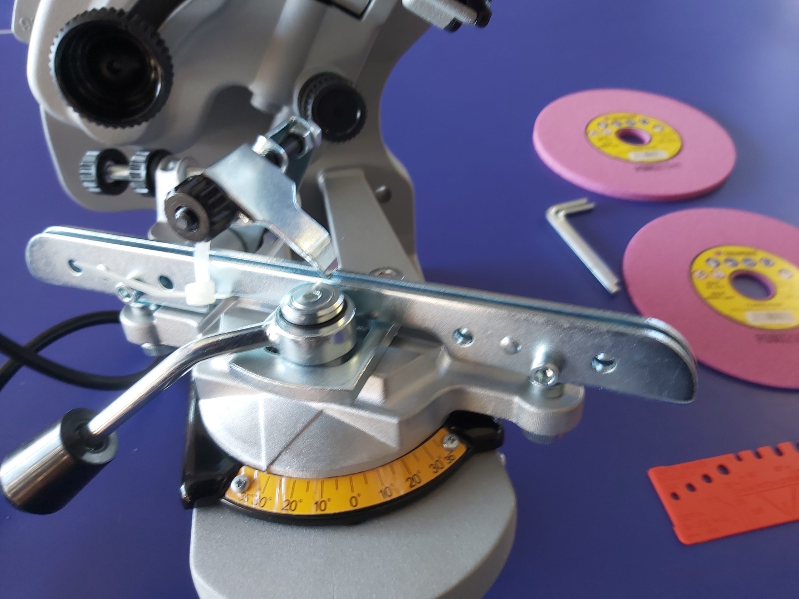 This grinder has a sliding chain carriage (holds the chain) it has a *0* position in the middle and 15 degrees forward and 15 degrees back so you can do full chisel chain at the correct angles.